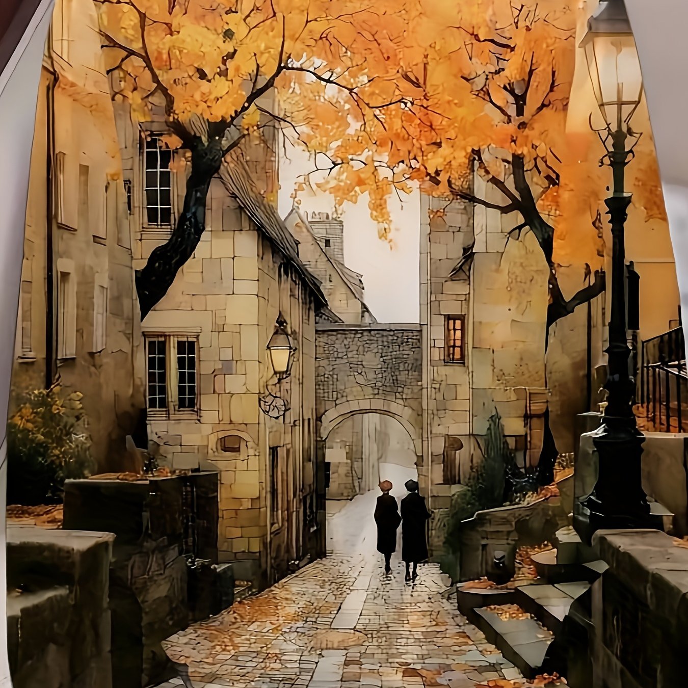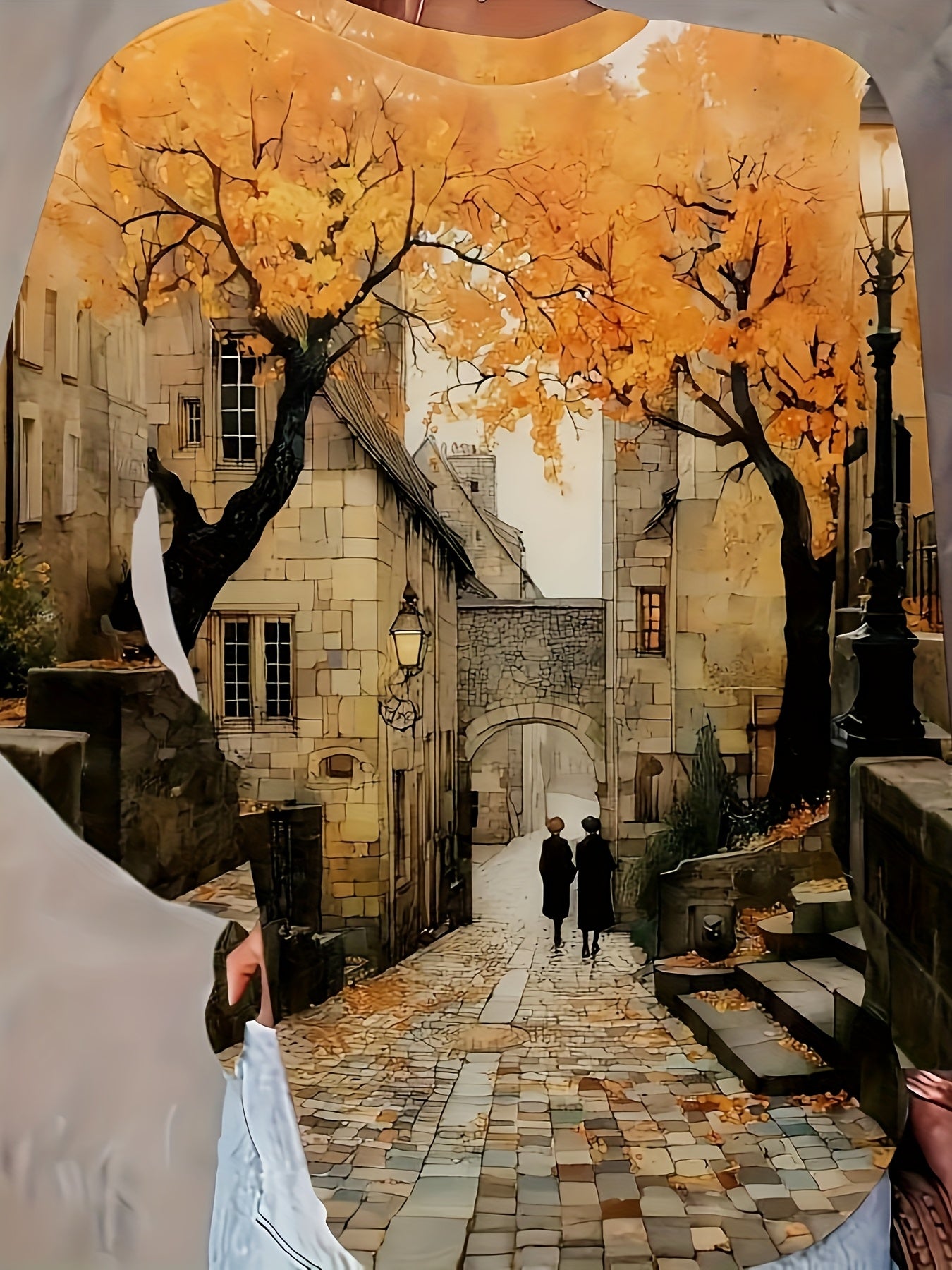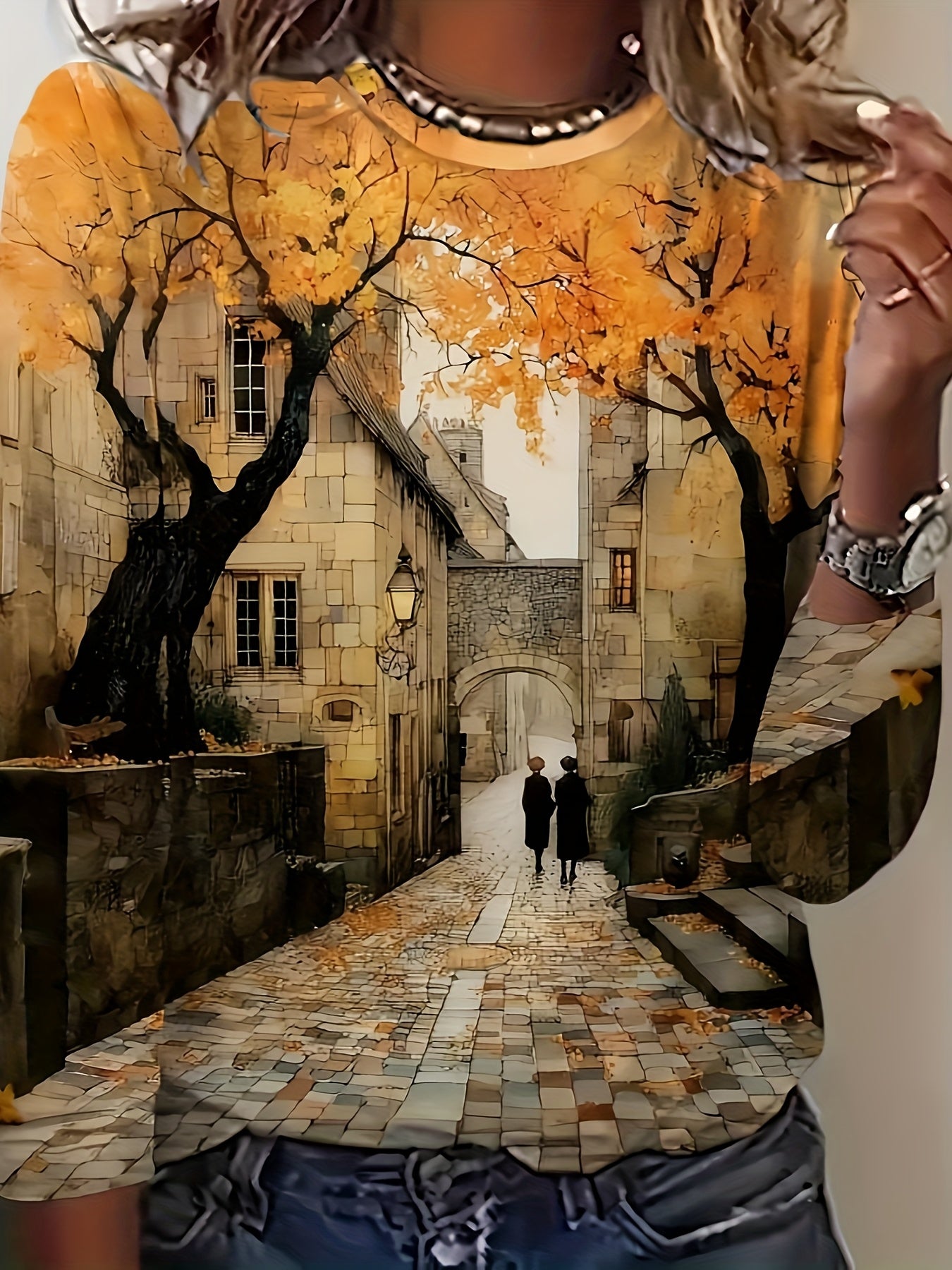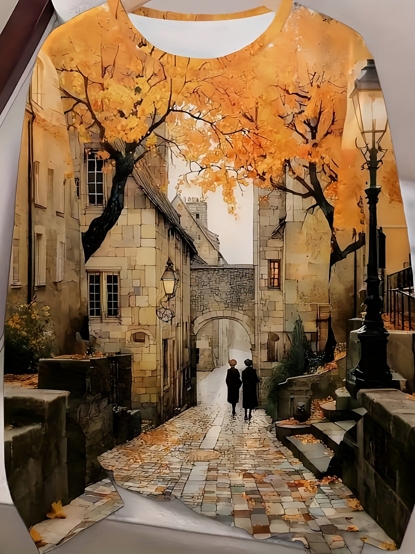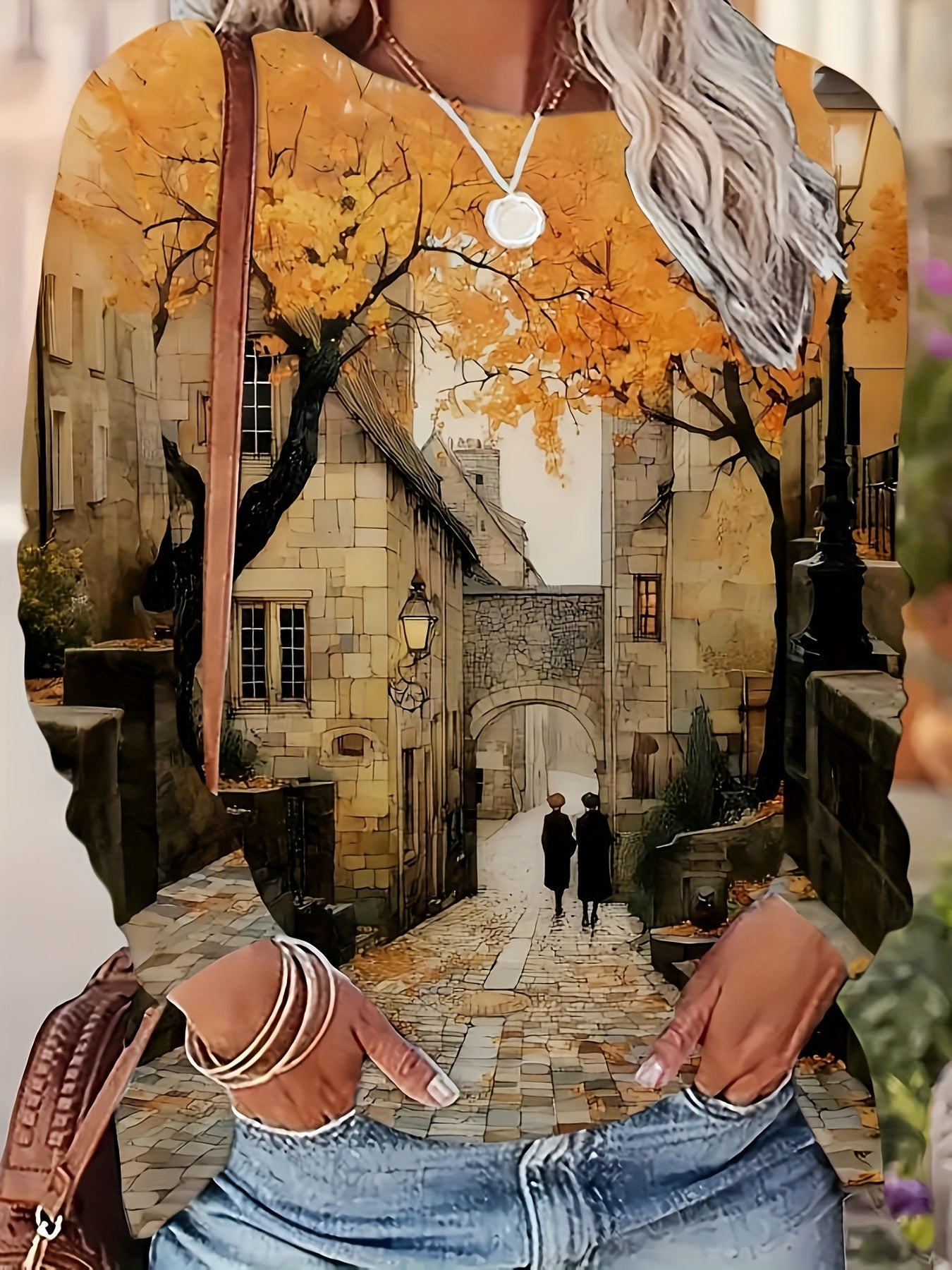 Amsterdam Canal Cobblestone Print Blouse Long Sleeve Casual Round Neck